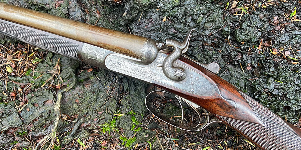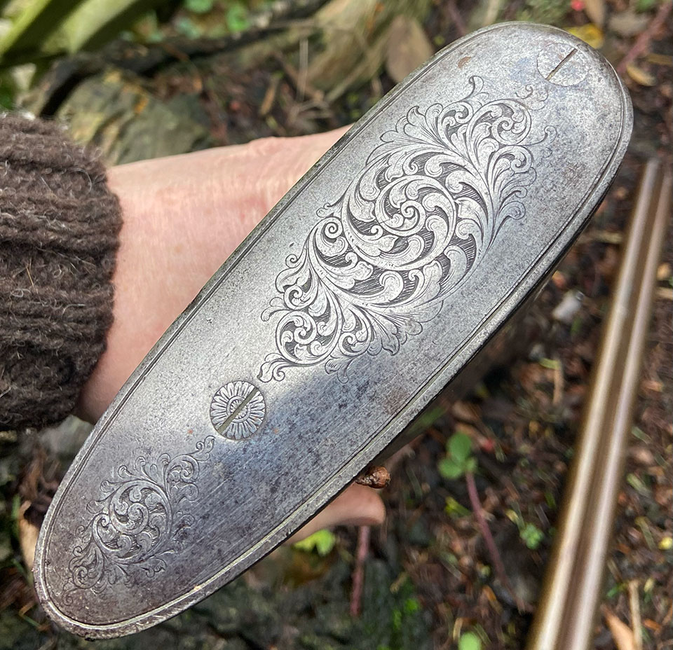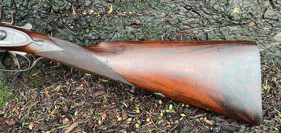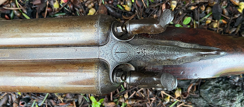 It bears serial number 9799, which dates it to 1896 and it is proofed in Birmingham for black powder. Chambers are 2 1/2" and it is very much a typical best-quality game gun of the period. The only unusual thing about it is the, smaller than usual, 16-bore, given that it was clearly bought by quite a tall man.